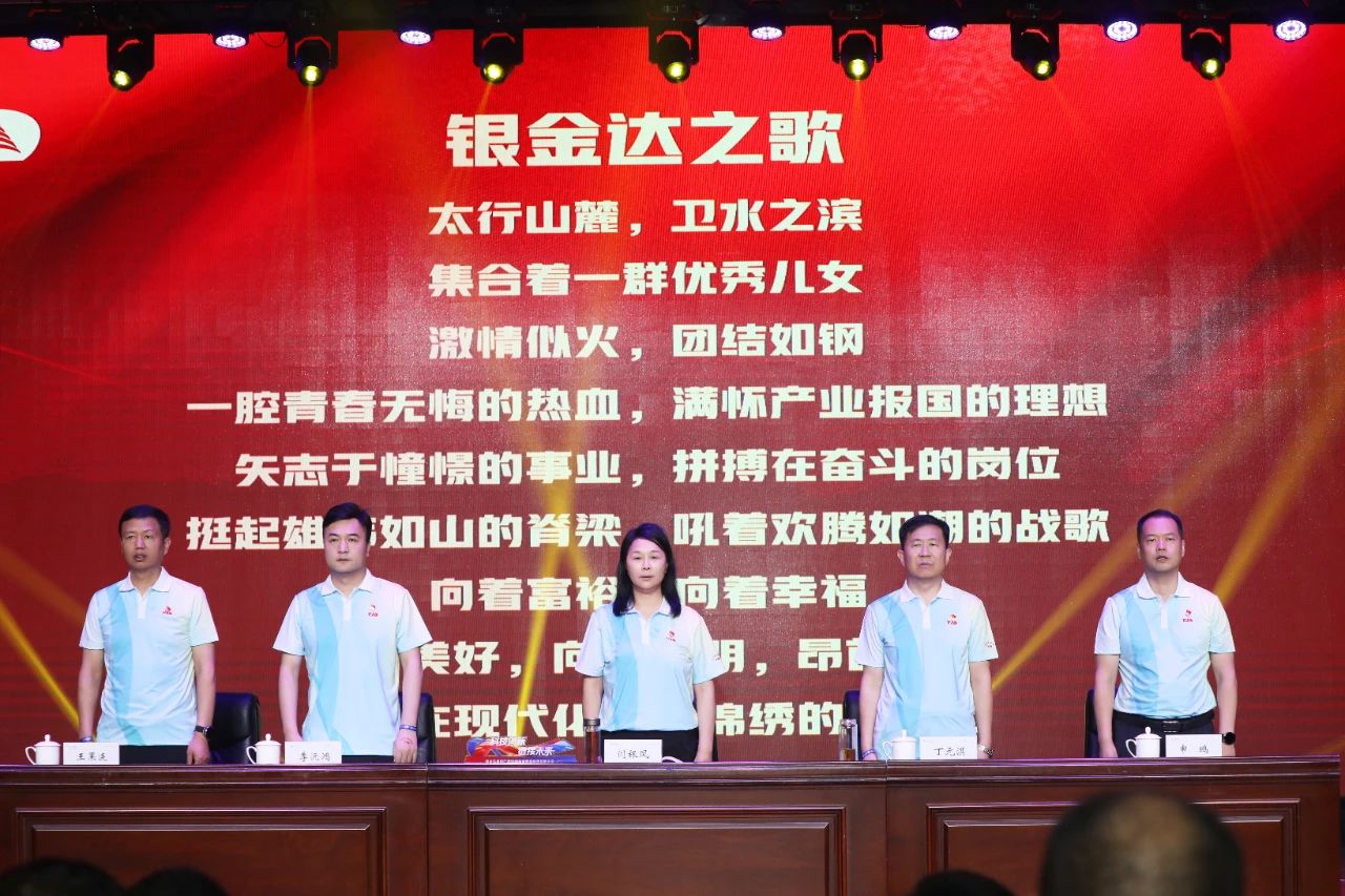 上午9:00,在唐庄干部教育学院主会场,大会在庄严的国歌声中正式拉开帷幕。全体与会人员肃立合唱,爱国情怀与企业担当在旋律中交融。随后,《银金达之歌》的激昂旋律响起,唱出了银金达人三十一年如一日的坚守与豪情。