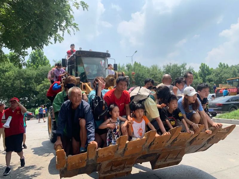 3、李沅鸿领队12人出动2辆铲车、2艘橡皮船、2辆班车、1辆集装箱车水中救援职工及其家属和受灾群众,运送至银金达安置点,并参加李良屯护堤防汛;