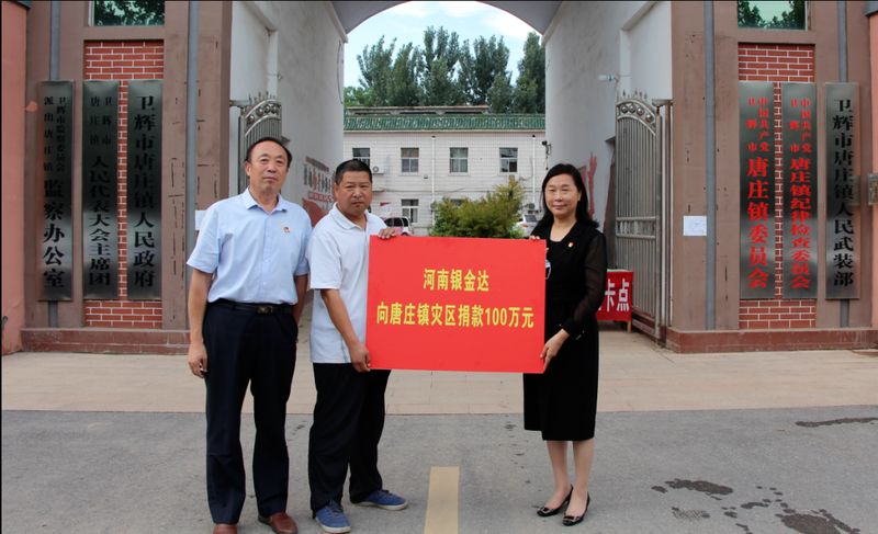 党委书记、董事长闫银凤代表河南银金达集团向唐庄镇人民政府捐资100万元;